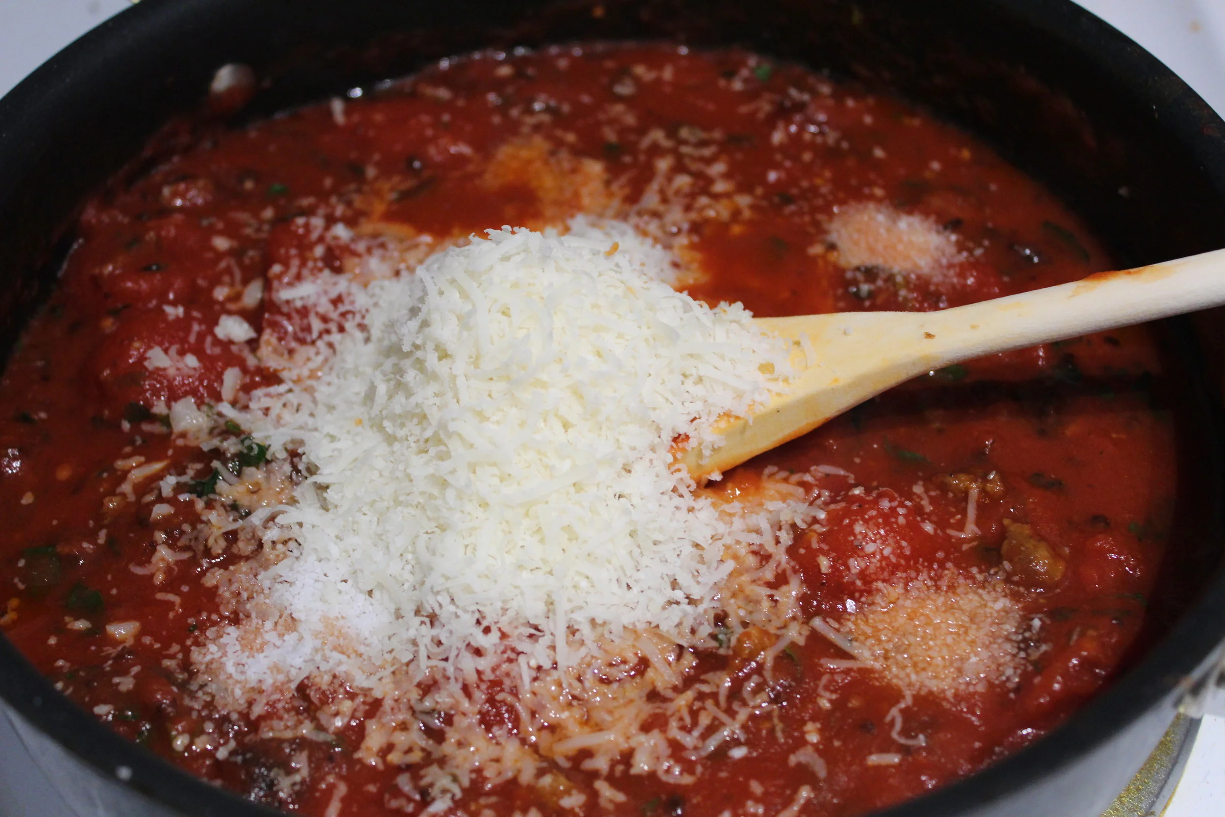 3) Heat a skillet on medium heat. Once the skillet is hot, add the Italian sausage. Use a spatula to break up the sausage. Cook the sausage until it begins to brown and develop crispy brown bits, about 5-7 minutes. Add the pasta water, hand crushed tomatoes, tomato paste, salt, pepper, chopped parsley, and sugar. Stir to combine. Add in half of the Parmigiano Reggiano cheese. Toss in the undercooked rigatoni pasta.